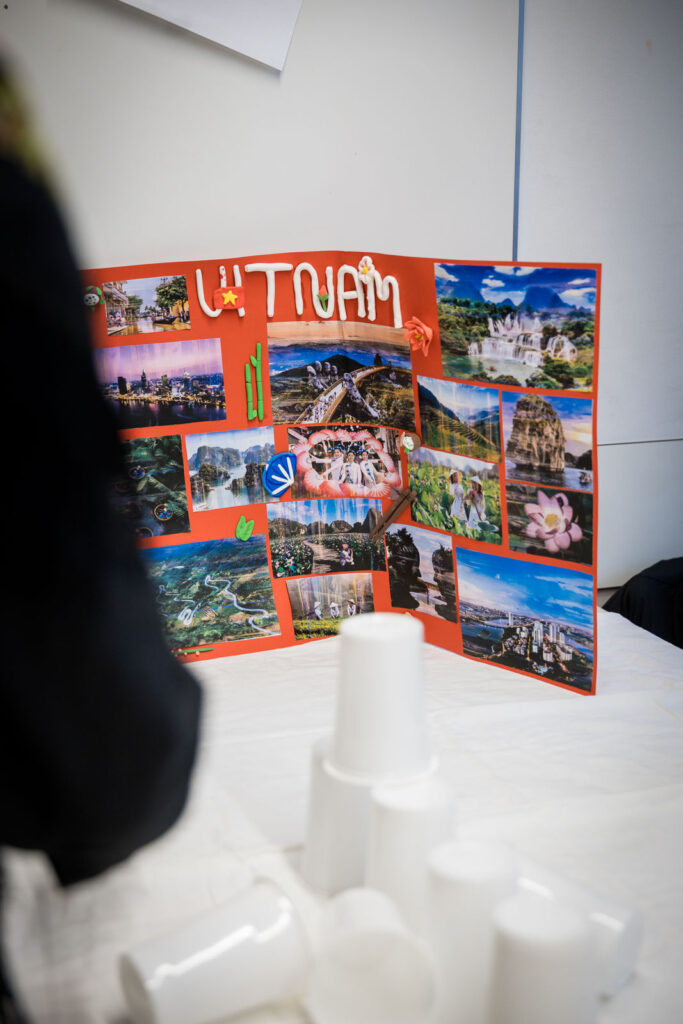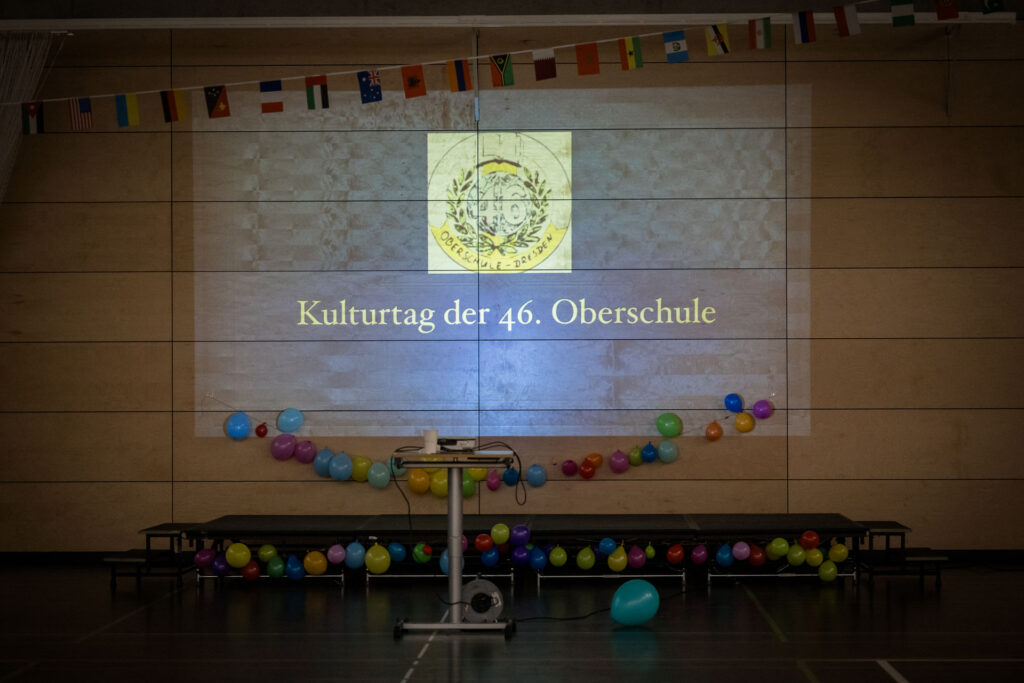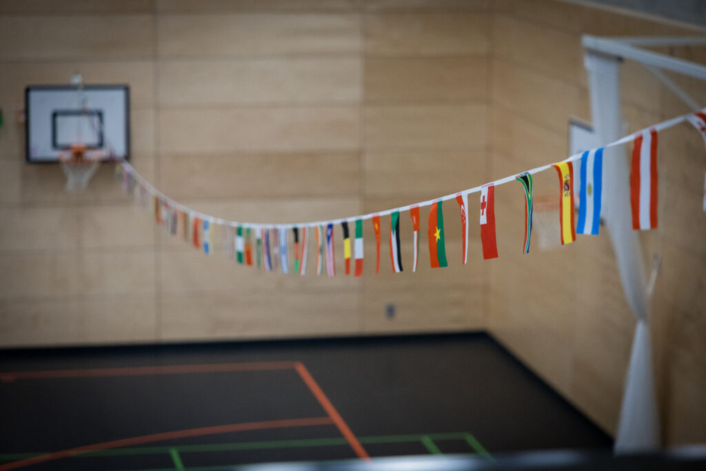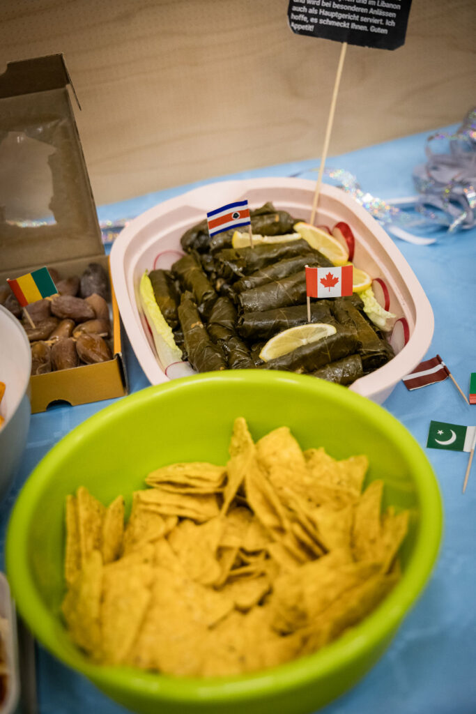 Der Höhepunkt folgte mittags in der Sporthalle am Lukasplatz. Die Kontinente wurden nacheinander vorgestellt, begleitet von passender Musik. Schülerinnen und Schüler präsentierten ihr Land mit Flaggen und Tänzen auf der Bühne, unterstützt von Lehrkräften, die ebenfalls Teil des Programms waren. Ein Mitbringbuffet mit Speisen aus aller Welt rundete den Tag für alle kulinarisch ab.
